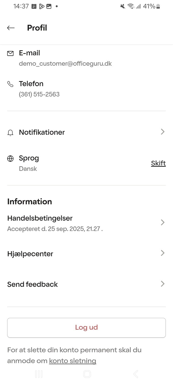 Når du benytter vores Officeguru-app, som du kan downloade via enten Google Playstore eller Appstore, har du mulighed for direkte fra appen at anmode om sletning af din konto.