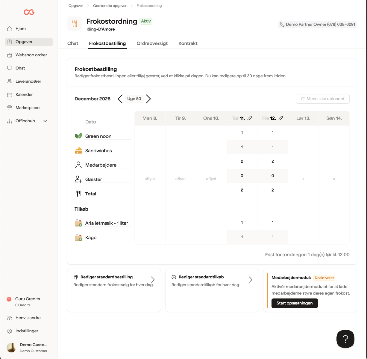 🔔 OBS: Vær opmærksom på, at så snart du vælger at næste ordre skal være baseret på medarbejdernes egne valg, vil leverandøren begynde at modtage ordrer i overensstemmelse med medarbejdernes valg og ikke antallet angivet på kontrakten. Dette betyder, at hvis alle medarbejdere er tilmeldt frokost hver dag, vil dette være de ordrer, leverandøren modtager. Det er derfor vigtigt at sikre, at tilmeldingslisten afspejler medarbejdernes frokostbehov, inden modulet aktiveres.