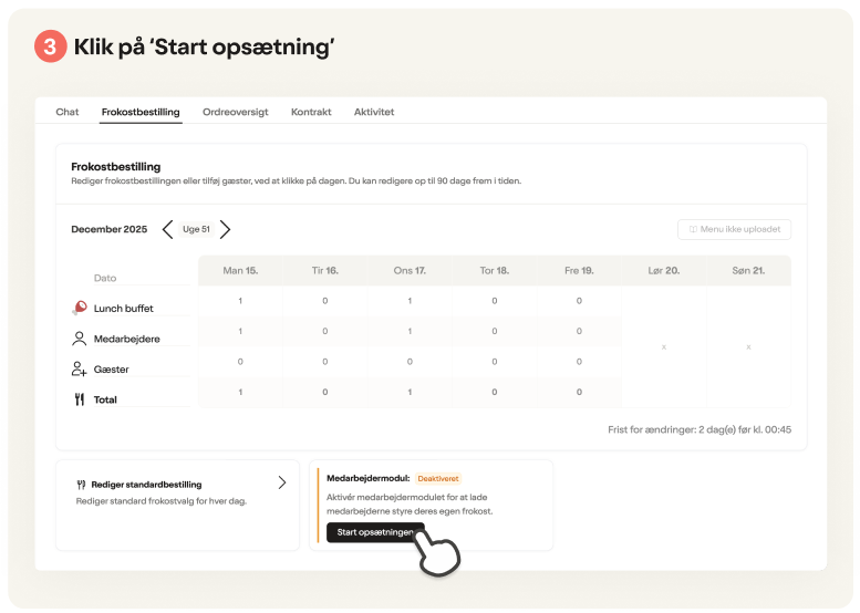 Når medarbejderne har opsat deres standardbestillinger, skal du aktivere modulet igen ved at vælge Start opsætningen, så fremtidige ordrer baseres på deres individuelle valg.