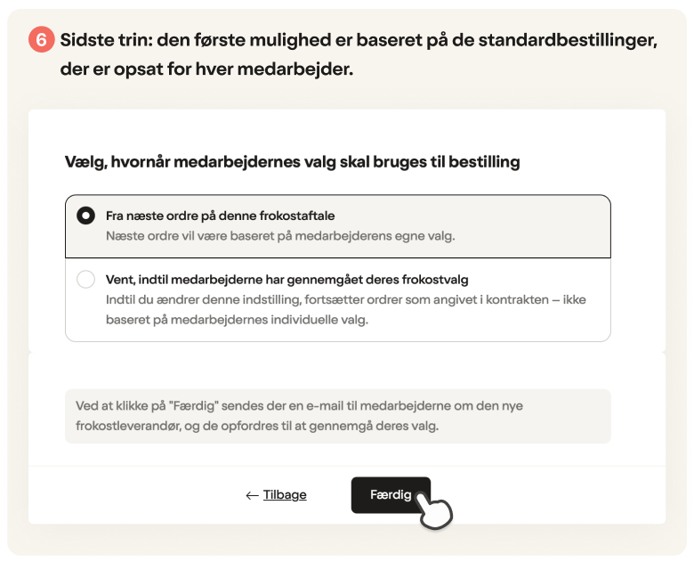 I det sidste trin beslutter du, hvornår medarbejdernes individuelle frokostvalg skal danne grundlag for bestillinger på aftalen.